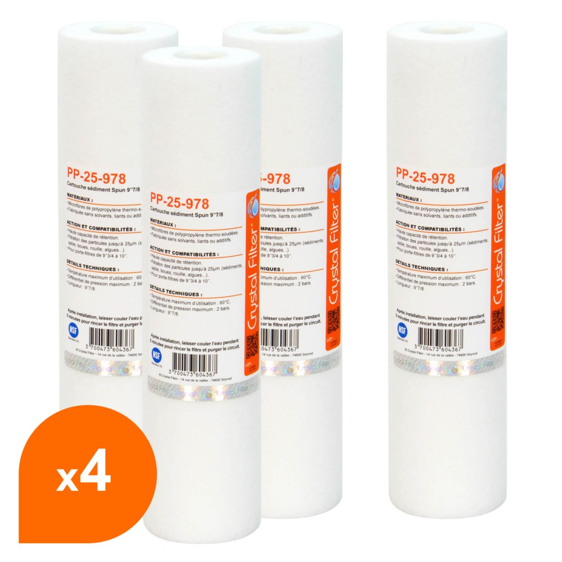 - La cartouche SPUN Crystal Filter PP-25-978 est utilisable dans une grande variété d'application de filtration d'eau : eau de réseau, préfiltre pour osmose inverse, eau potable et autres boissons, filtration industrielle, eau de pluie, etc…