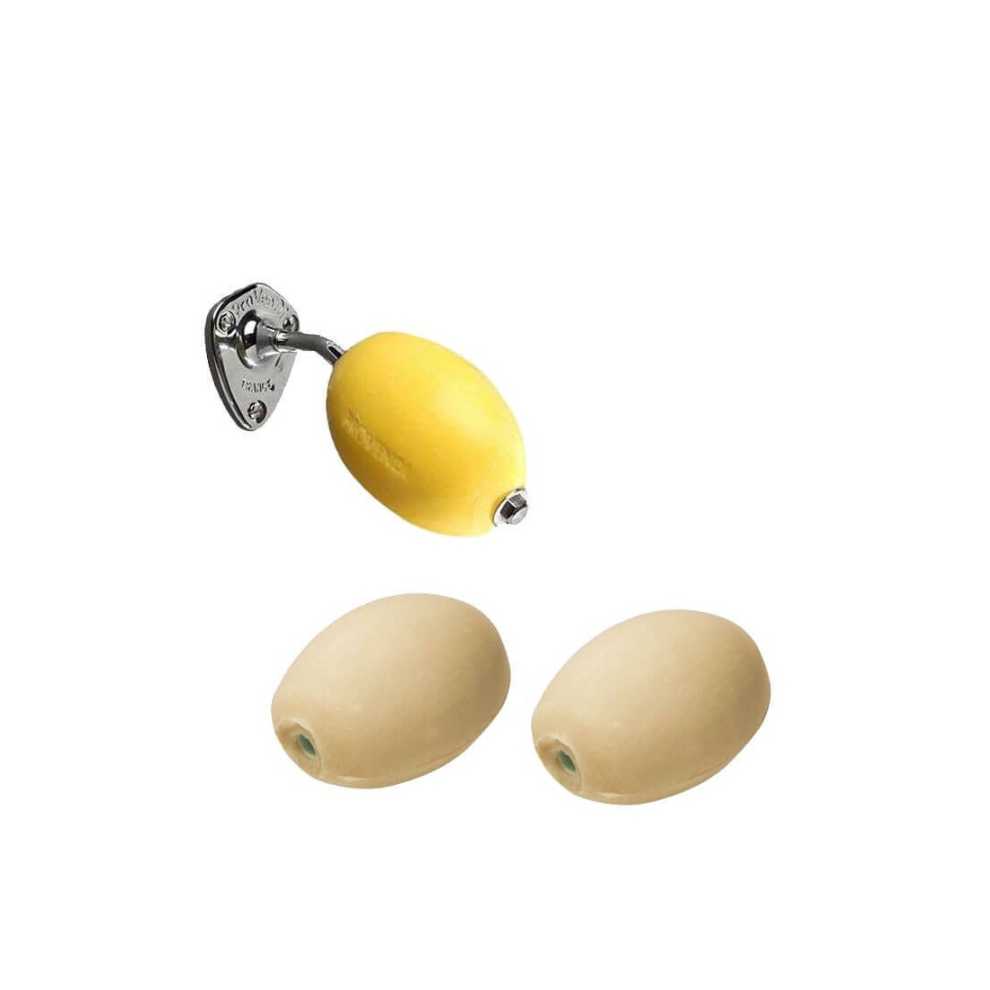 - 3 recharges : 1 savon jaune citron et 2 savons blancs parfum lait d'amande rotatifs Provendi.