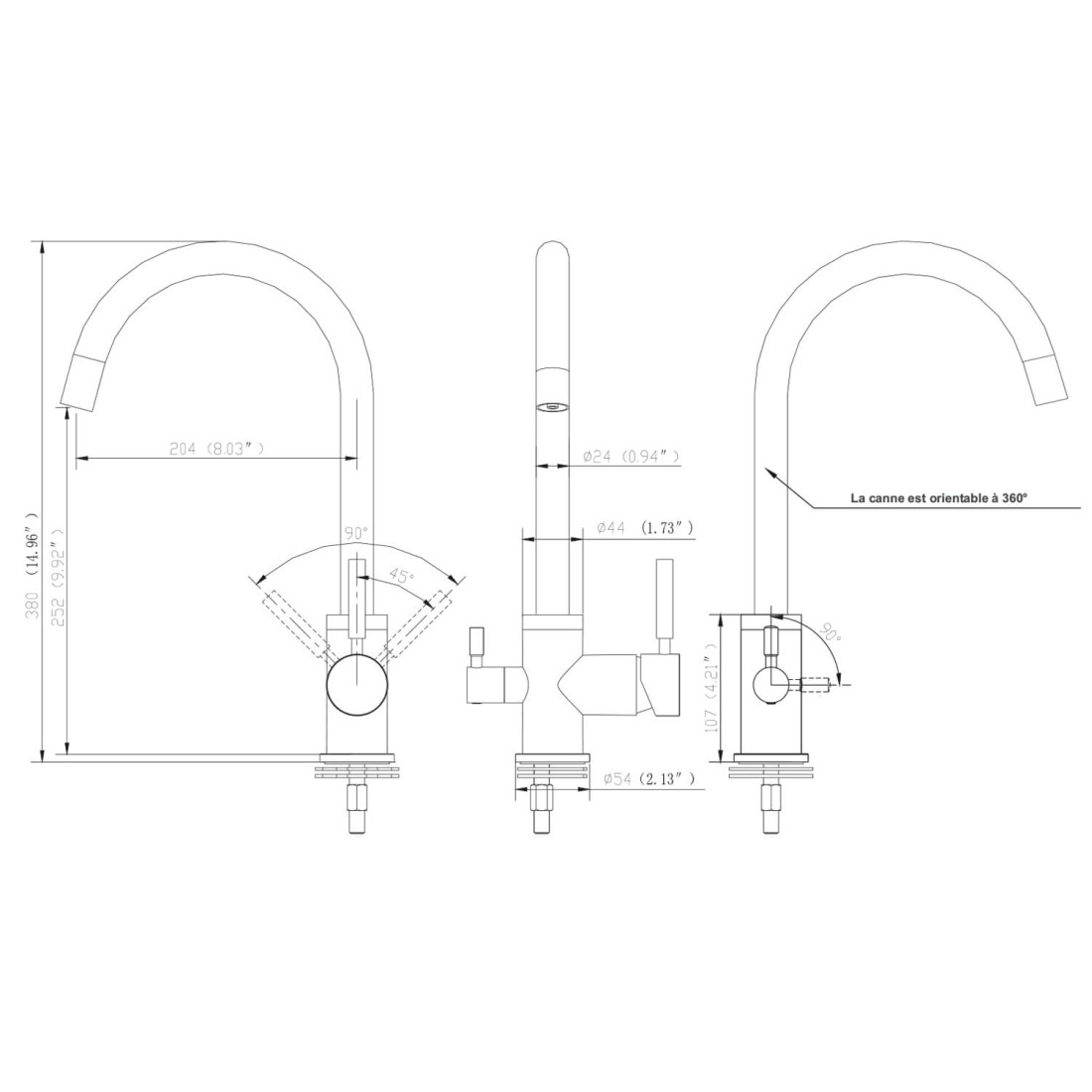 Dimensions du robinet mitigeur "Biscayne" 3 voies :