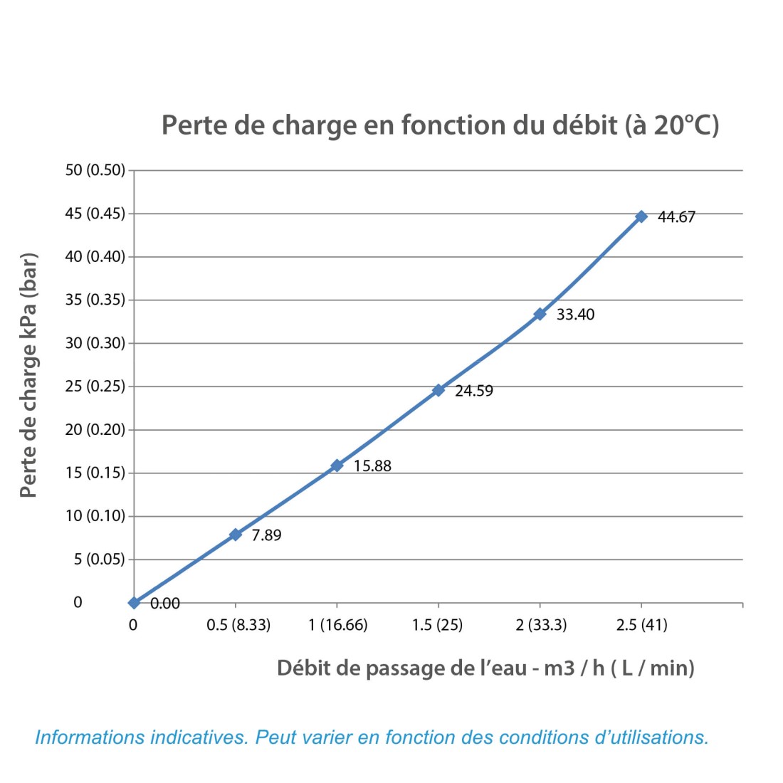 - Perte de charge indicative (en condition de test et à 20°C) : 15.8 kPa (0.16 bar) à 1 m3/h (16.66 L/min)