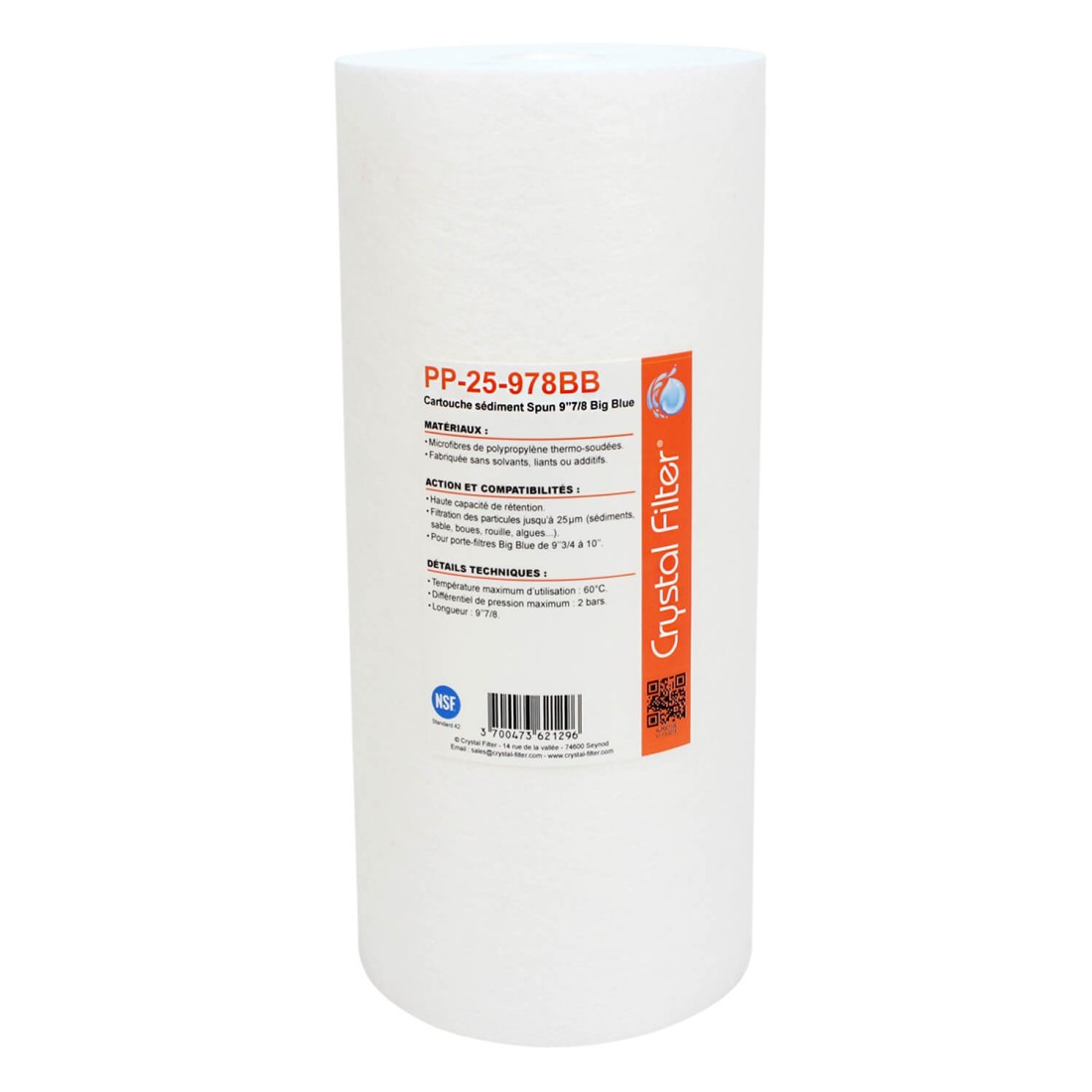 La cartouche SPUN Big Blue Crystal Filter PP-25-978BB est formée par liaison thermique (thermo-soudure) de microfibres de polypropylène de haute qualité approuvé FDA : Certificat NSF.