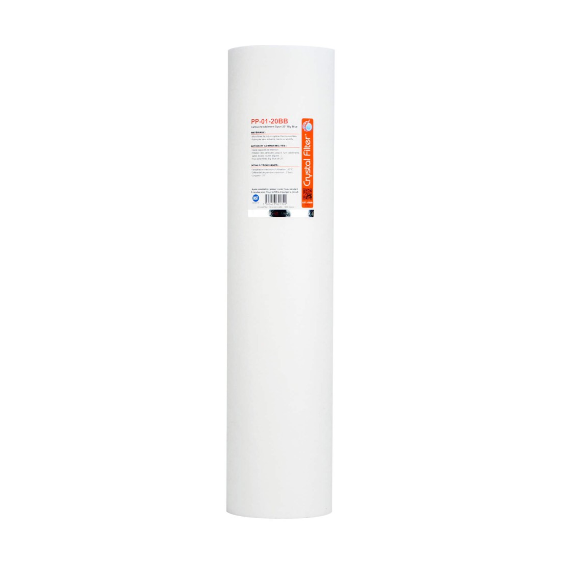 La cartouche SPUN Big Blue Crystal Filter PP-01-20BB est formée par liaison thermique (thermo-soudure) de microfibres de polypropylène de haute qualité approuvé FDA : Certificat NSF.