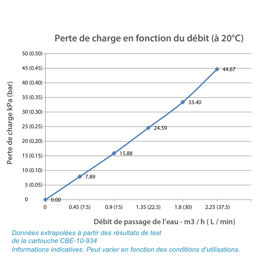 - Perte de charge indicative (en condition de test et à 20°C) : 15.8 kPa (0.16 bar) à 0.9 m3/h (15 L/min)