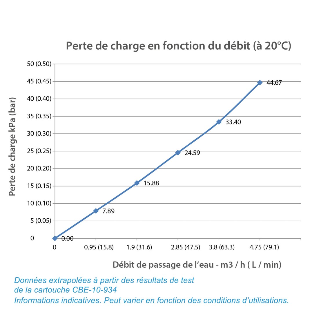 - Perte de charge indicative (en condition de test et à 20°C) : 15.8 kPa (0.16 bar) à 1.9 m3/h (31.6 L/min)