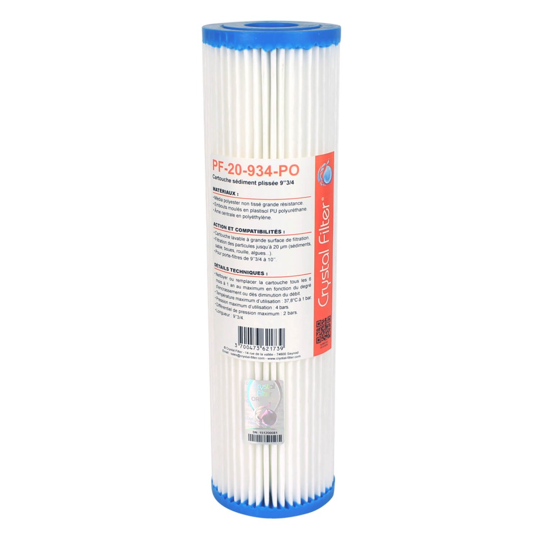 Cartouche sédiment plissée à grande surface de filtration Crystal Filter PF-20-934-PO. Filtre à eau de taille 9''3/4 (~ 24.8 cm de longueur).