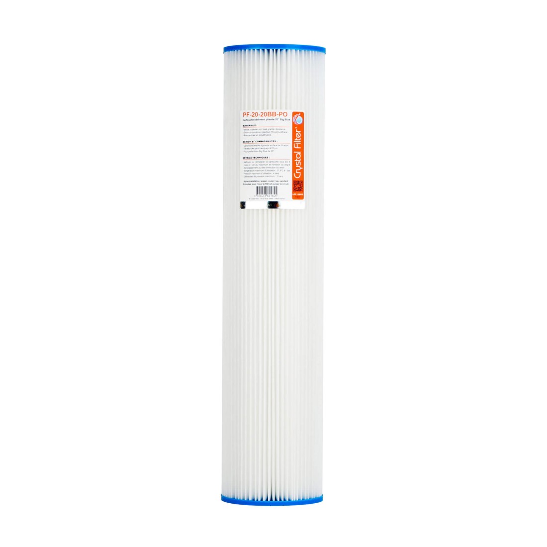 Cartouche sédiment plissée à grande surface de filtration Crystal Filter PF-20-20BB-PO. Filtre à eau de taille 20''(~ 50.8 cm de longueur) Big Blue (~ 11,4 cm de diamètre).