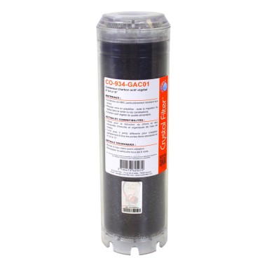 Conteneur de charbon actif végétal granulaire de qualité alimentaire, utilisé pour la réduction du chlore, des composés chlorurés et organiques de l'eau. Crystal Filter® CO-934-GAC01.