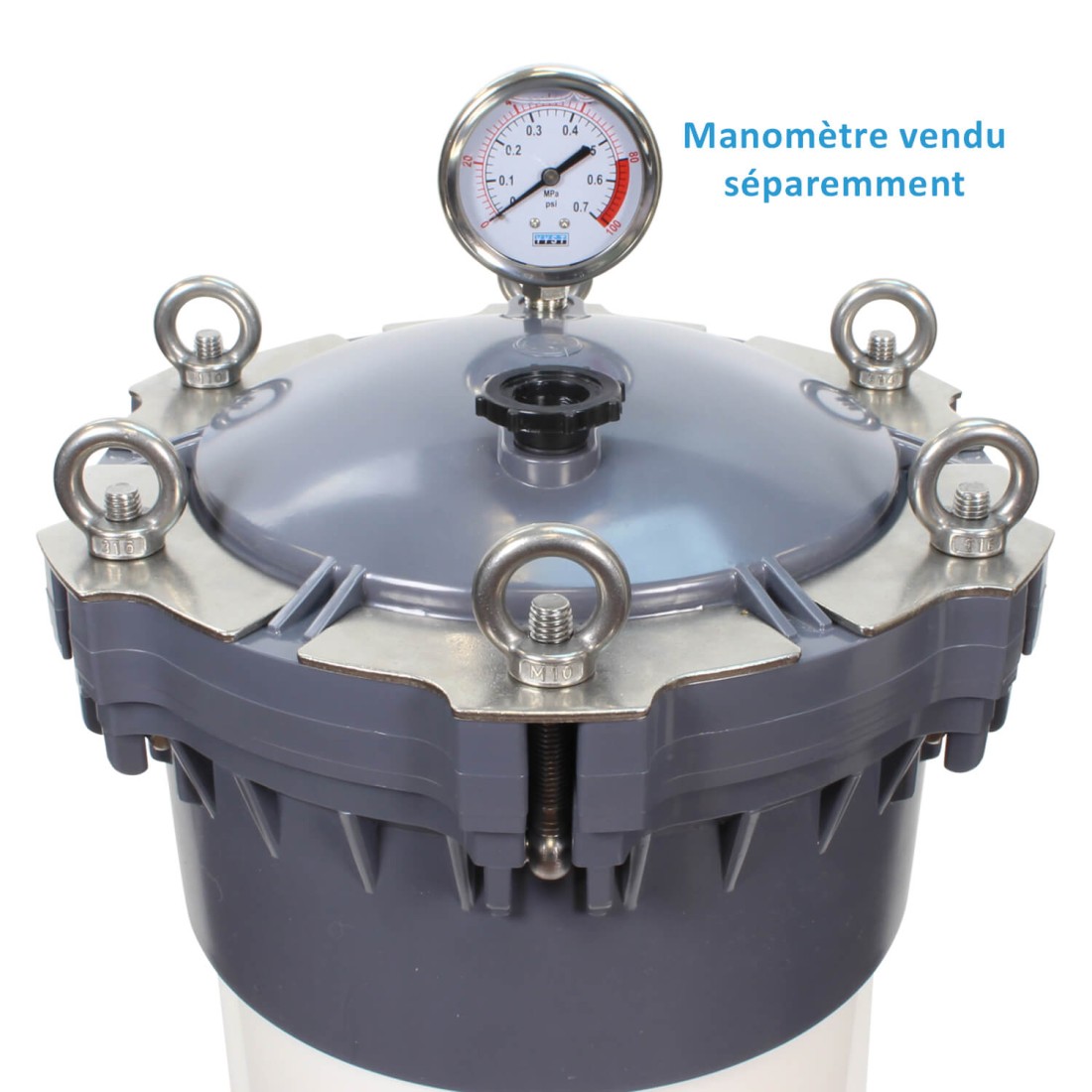 - Deux piquages en 1/4'' sur le couvercle (2 purges fournies) : Utilisables pour tout accessoire 1/4'' (Manomètre par exemple)