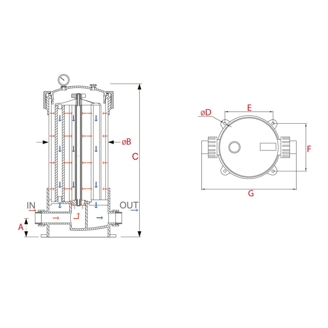 Tous les éléments principaux du corps de filtre multi-cartouches Crystal Filter® FHPVC-40x5-B2 sont en PVC pression. L’entrée et la sortie sont sur le même axe, avec des connexions en 63 mm femelle à coller sur union 3 pièces.