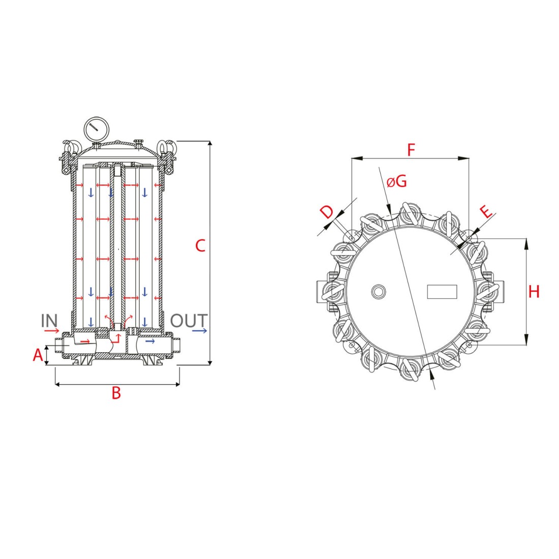 Ce carter de filtre multiposte accepte tout type de cartouches (charbon, spun, bobiné, plissée…) de longueur 20’’, avec embouts DOE (standard double extrémité ouverte), de diamètre intérieur 28 (strict) à 30 mm et de diamètre extérieur 70 mm maximum.