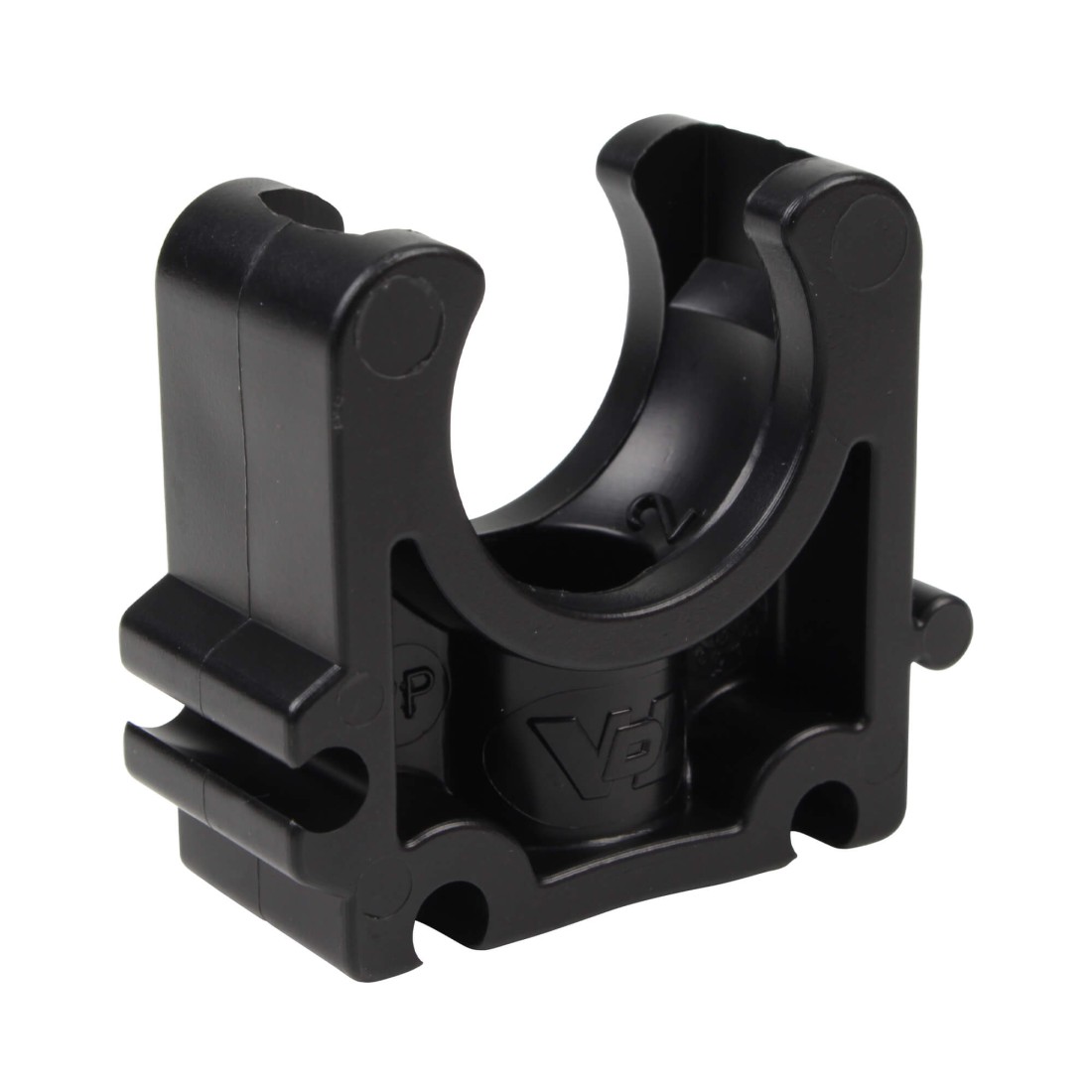 Matière PP noir. Fixation par vis, avec clip de retenue en PVC.