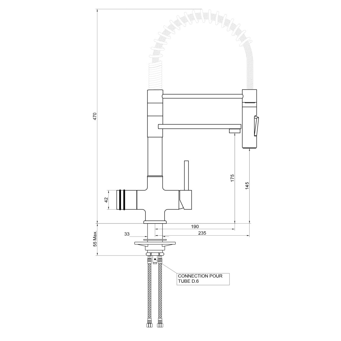 - Hauteur du robinet : 47 cm douchette bloquée / 51 cm douchette débloquée