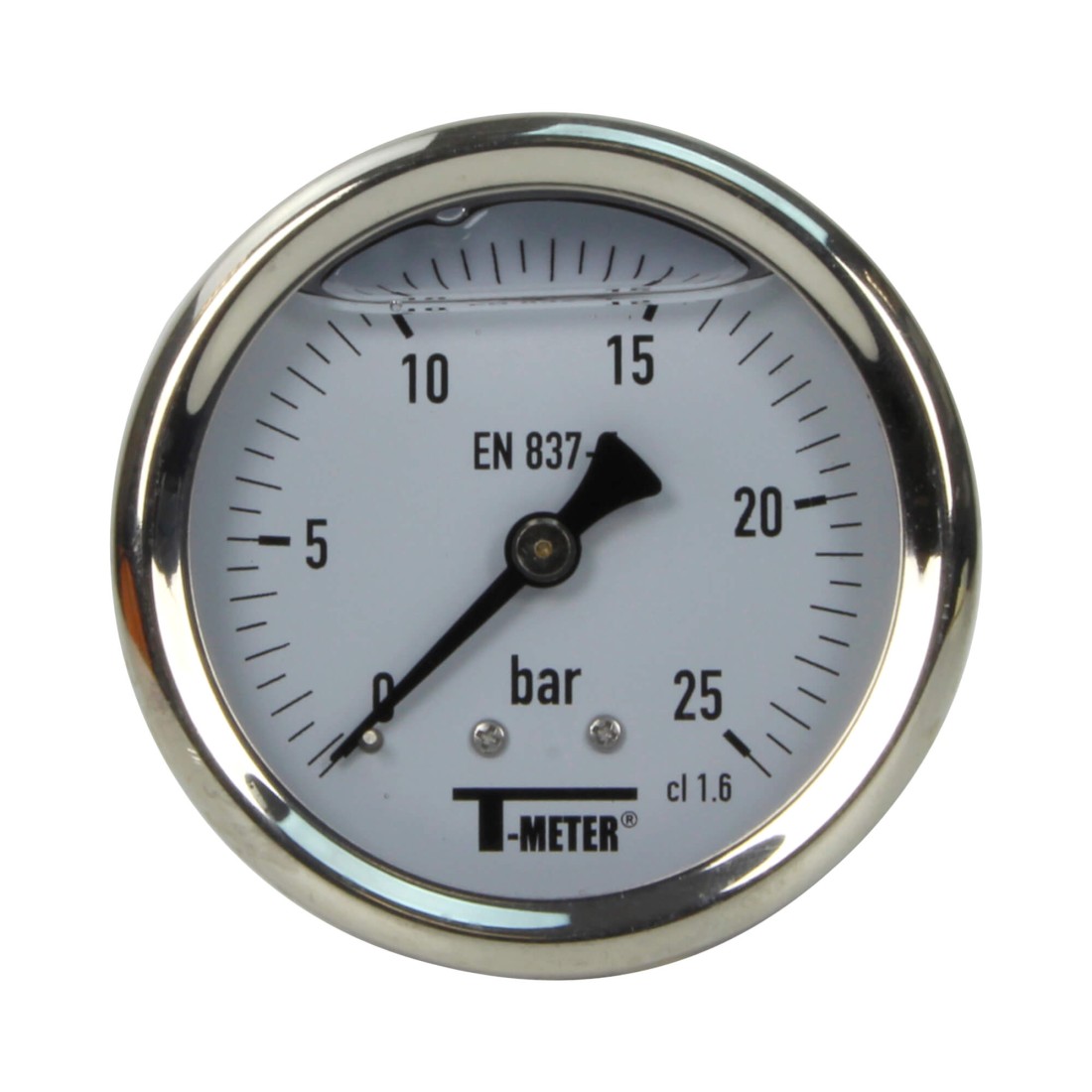 Ce manomètre à glycérine axial permet de mesurer la pression de 0 à 25 bars, soit 0 à 362 psi qui se trouve dans une canalisation.
