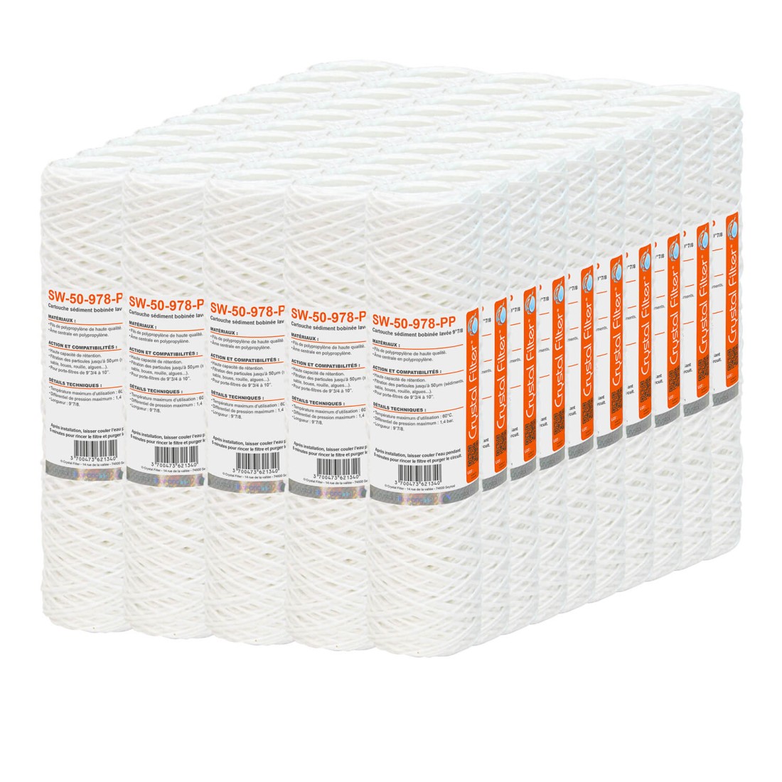 - Le filtre à eau bobiné Crystal Filter SW-50-978-PP est utilisable dans une grande variété d'application de filtration d'eau : eau de réseau, préfiltre pour osmose inverse, eau potable et autres boissons, filtration industrielle, eau de pluie, etc…