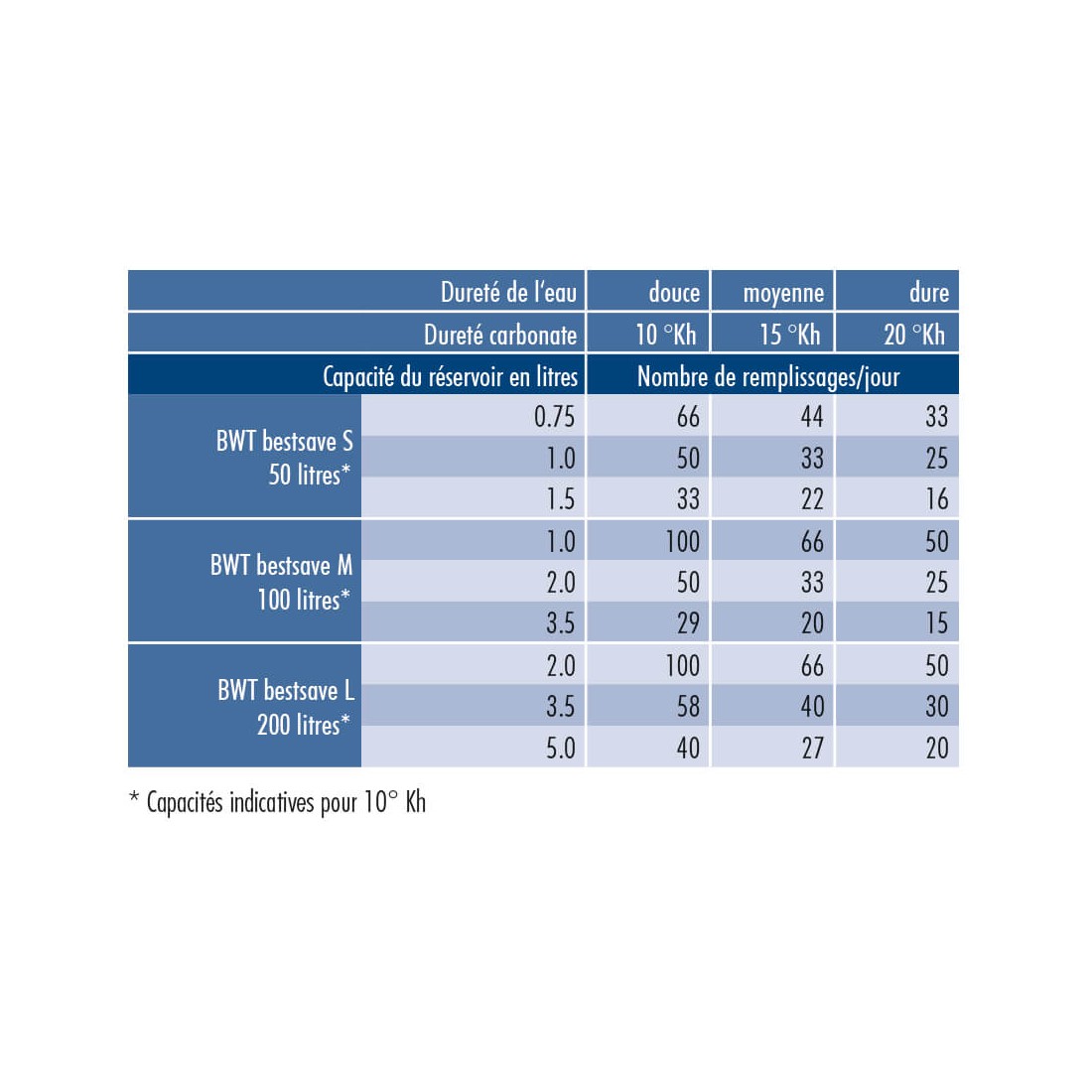 Si votre eau est "douce" et que vous remplissez votre réservoir de 3.5 litres chaque jour, un sachet BestSave L dure donc environ 58 jours.