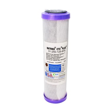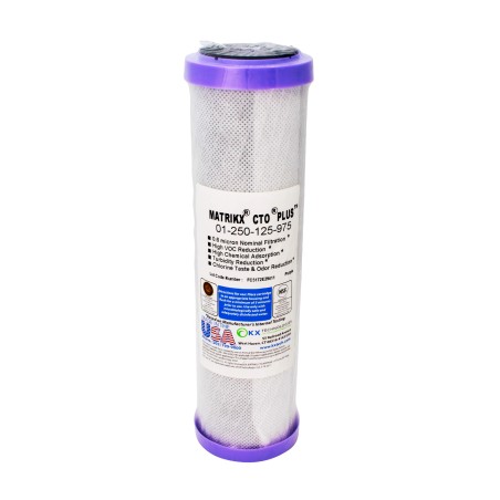 Filtre charbon actif Matrikx® CTO® PLUS, pour la réduction des goûts et odeurs de chlore et de la chloramine. Permet de réduire également les COV (Composés organiques volatils). Fabriqué avec du charbon actif de noix de coco de qualité.