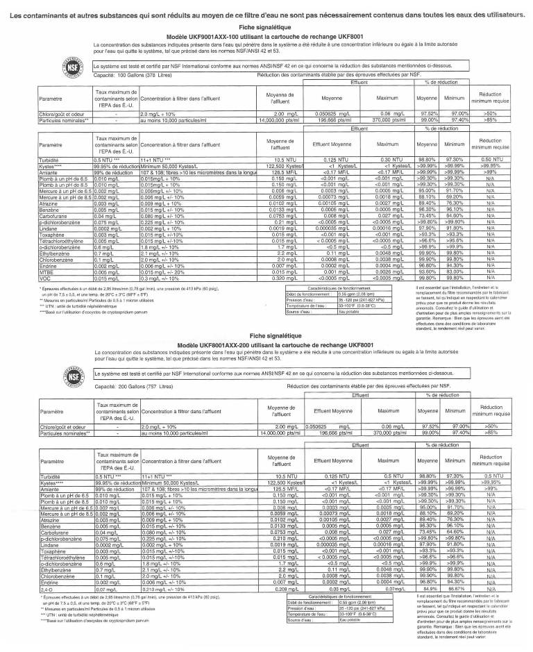 - Débit : UKF8001AXX-750 / 67003523-750 : 2.95 lpm - UKF8001AXX-200 / UKF9001AXX-100 : 2.08 lpm