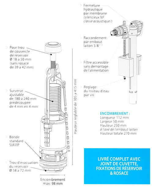 • La chasse d'eau possède un mécanisme qui s'adapte à tous les réservoirs standards.
