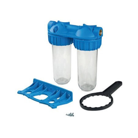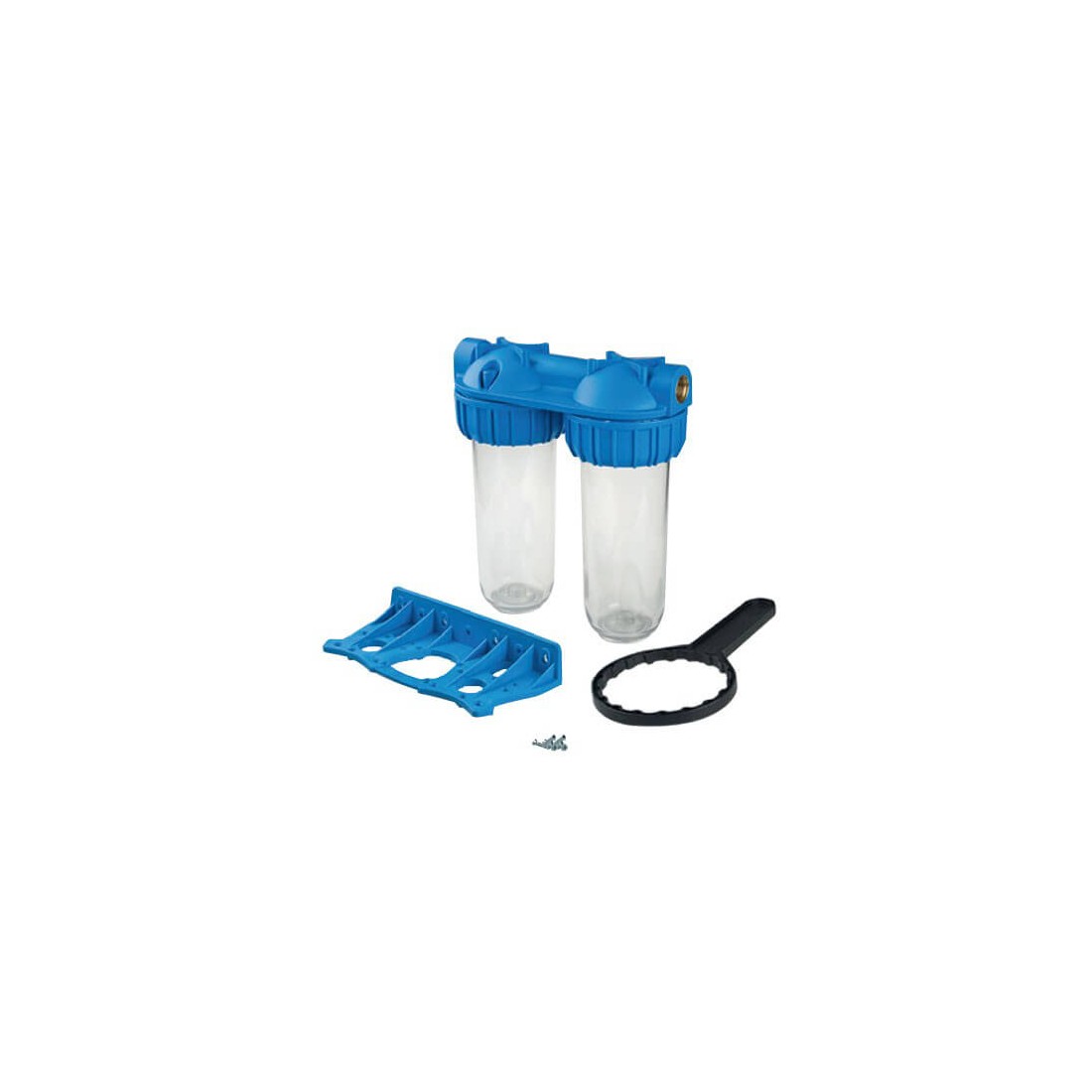 Carter porte filtre duo standard de taille 10'' (hauteur) avec raccord entrée et sortie en 3/4'' taraudé.