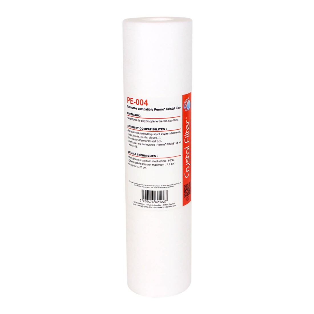 La cartouche de filtration Crystal Filter PE-004 compatible Permo Cristal Eco est la cartouche indispensable. Elle protège les circuits d'eau de la maison et de tous les appareils ménagers, ballons, chauffe-eau, robinets et mitigeurs, chasses d'eau, brise-jets, douchettes, ...