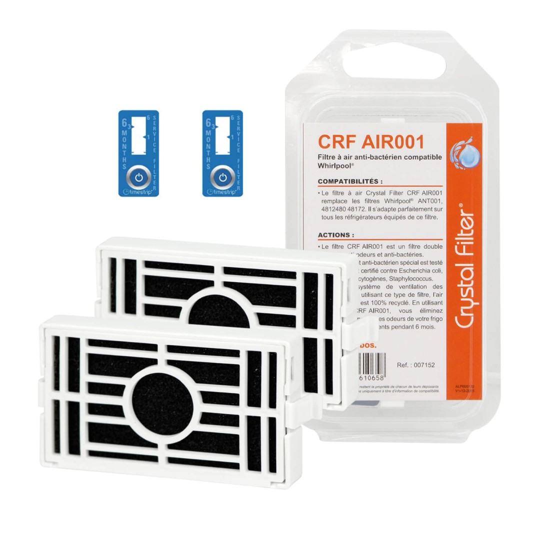 - Les filtres à air Crystal Filter CRF AIR001 remplacent les filtres Whirlpool® ANT001, 4812480 48172, Microban ANTF-MIC et Bauknecht HYG001 - 481248048173 - PUR100 - PUR101. Ils s'adaptent parfaitement sur tous les réfrigérateurs équipés de ce filtre.