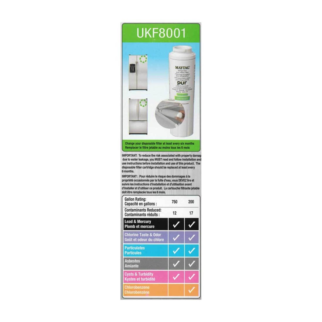 Filtre à eau UFK8001 pour réfrigérateur de marque Maytag Puriclean II. Il se place à l'intérieur du compartiment du réfrigérateur Amana, Maytag, Whirlpool. Il remplace Puriclean II, Puriclean III, UFK8001, UKF9001AXX, UKF8001AXX, 12589208, UKF8001AXX.