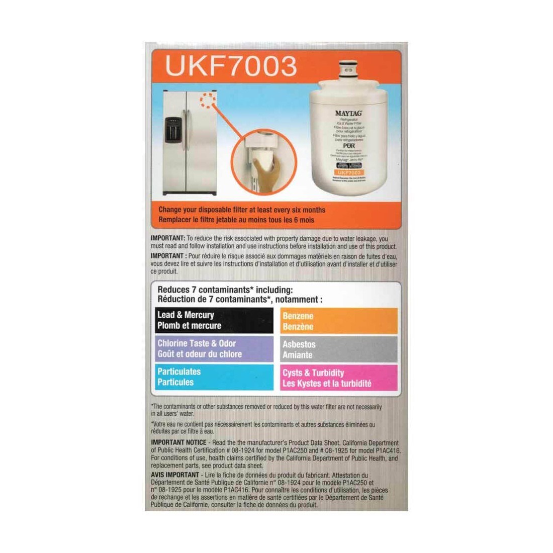 Le filtre à eau Maytag Puriclean réduit 7 contaminants notamment : le plomb et le mercure, le benzène, le goût et odeur du chlore, les particules, l'amiante, les kystes et la turbidité.