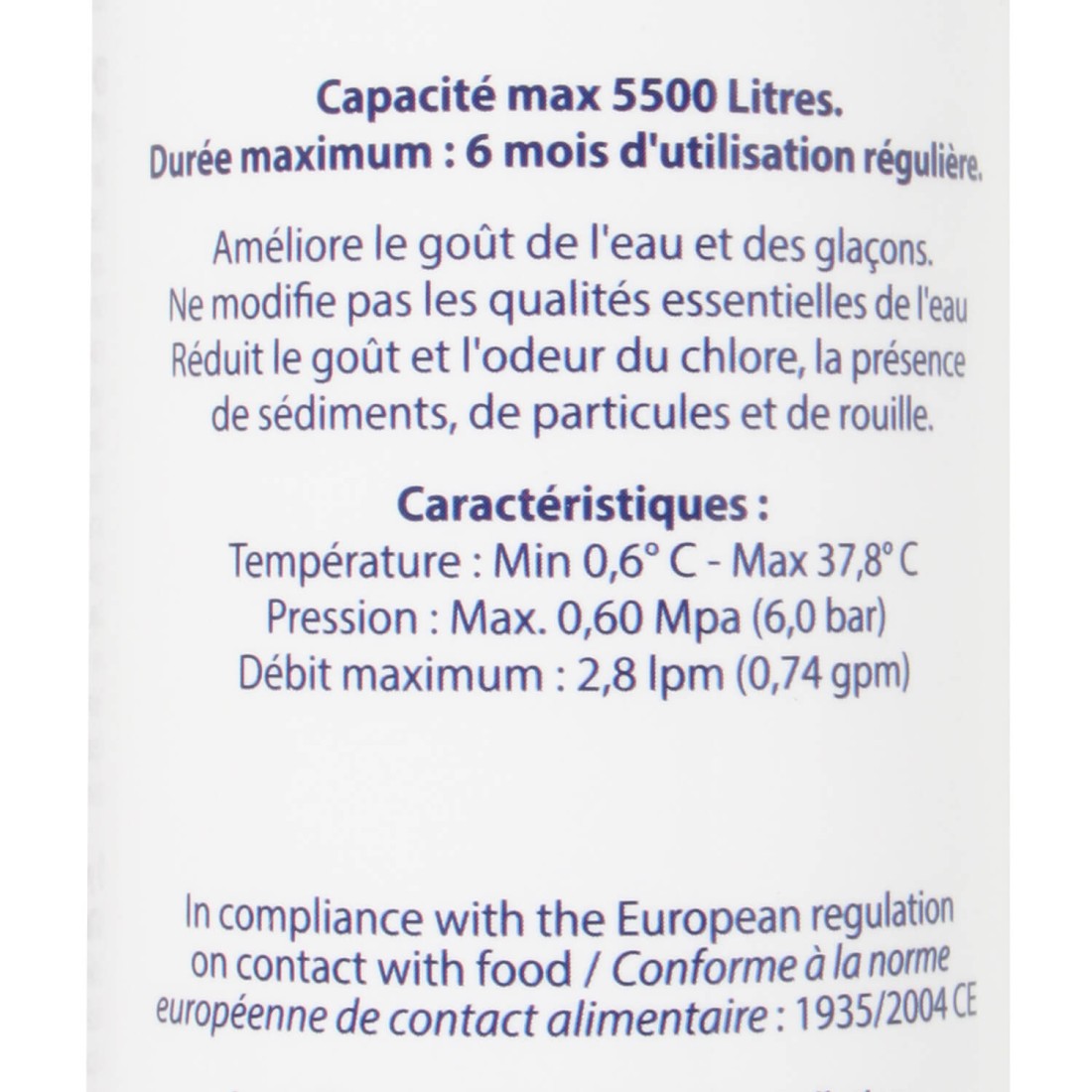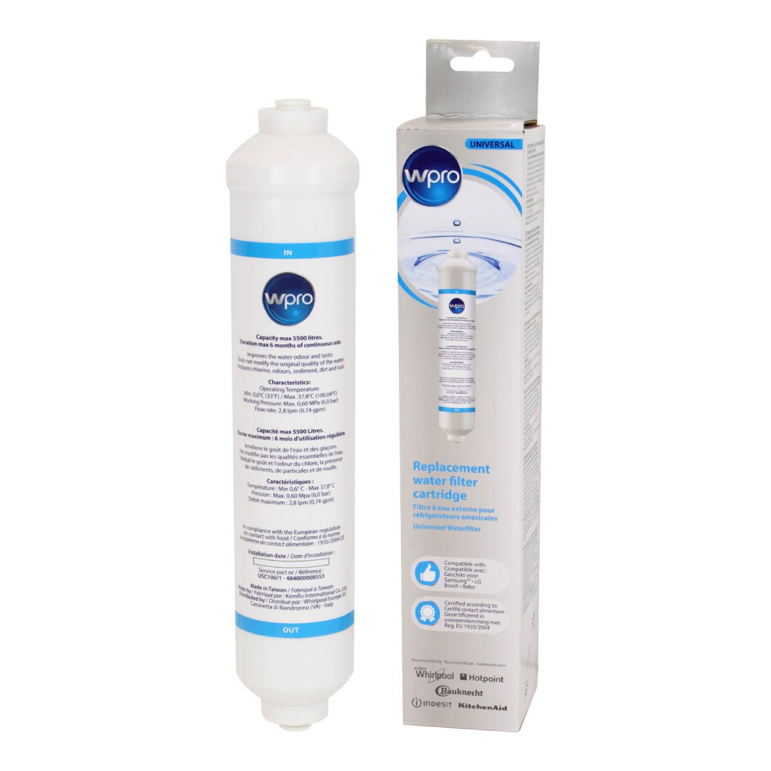 Le filtre Wpro USC100 améliore le goût de l'eau et l'aspect des glaçons, il réduit les odeurs désagréables, la teneur en chlore, les bactéries et autres particules.