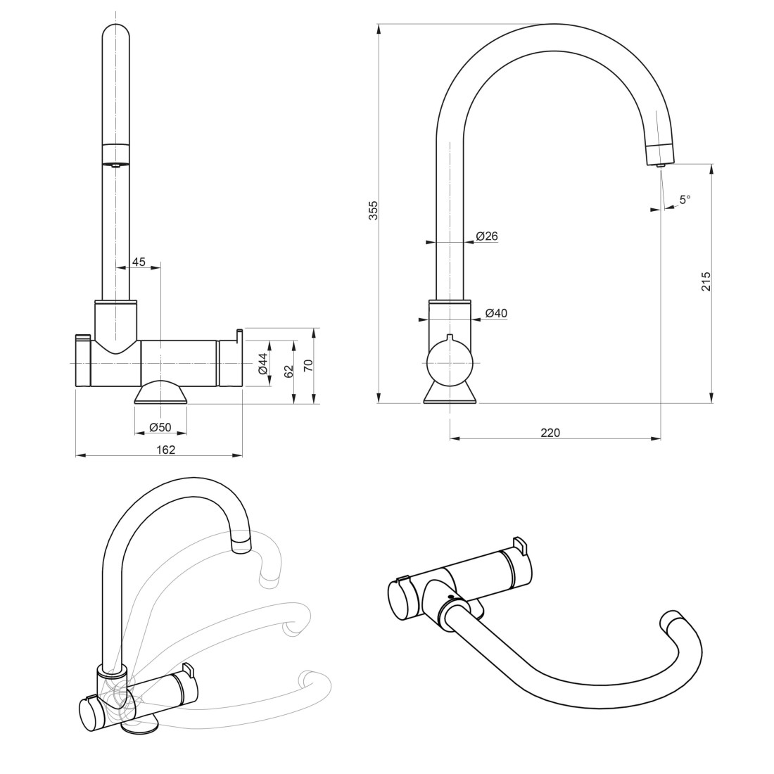 De plus, la canne rabattable du robinet Firenze permet une installation devant une fenêtre : hauteur avec poignée environ 70 mm, 75 mm recommandés pour installation. Le trou de perçage dans le plan de travail doit faire 33 mm de diamètre.